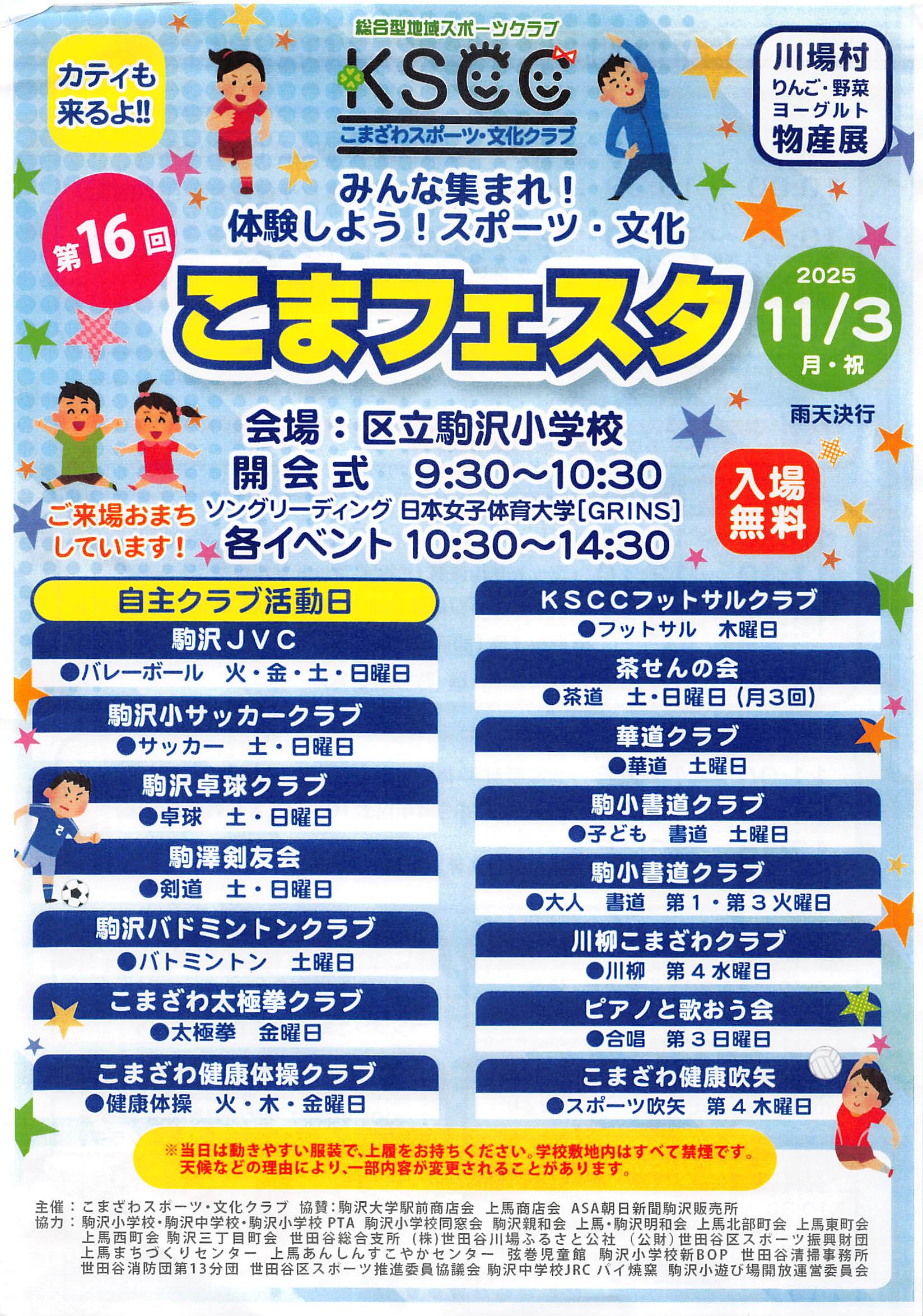 こまざわスポーツ・文化クラブは地域において活動の場所を確保し、地域の皆様のスポーツ、文化活動を通じて「子どもたちの健全育成」と「豊かな地域コミュニティの形成」を目的として、地域住民が主体的に自主運営していくものです。幼児から高齢者まで幅広い年齢層を対象とした複数の種目が継続的にそして定期的に用意され、地域の指導者の活用、将来的には学校の部活動との連携も視野に入れながら地域の活性化を図り、地域のコミュニティの場として、より明るく健康で豊かな地域生活の実現に向けて活動していくものです。